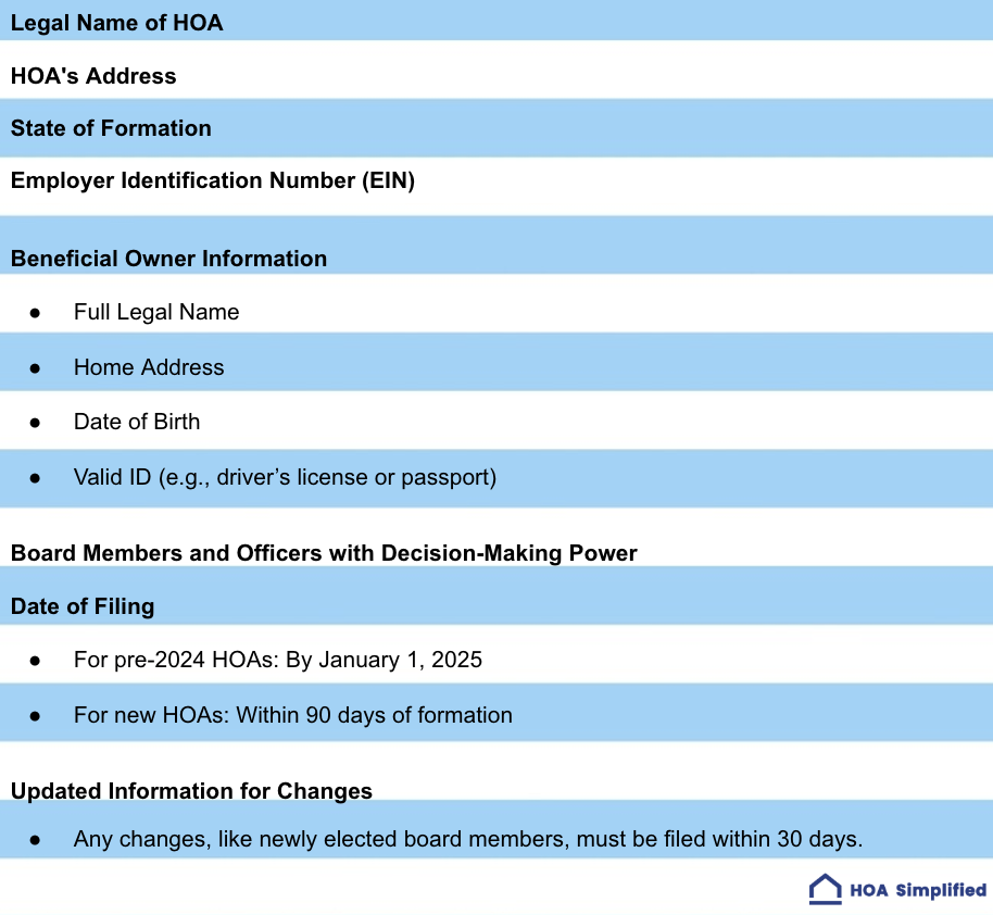 For HOAs formed before 2024: The deadline was January 1, 2025. If you haven't filed, you're already late and should submit immediately to minimize penalty exposure.