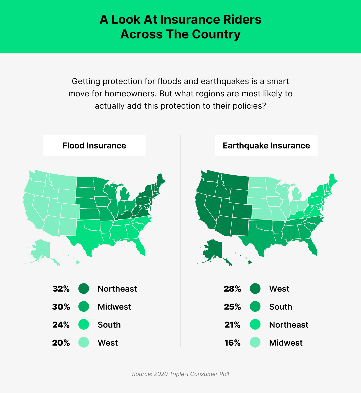 See the chart below. Homeowners are increasingly adding flood and earthquake insurance to their plan. In the west, 20% have flood insurance while 28% have earthquake insurance.