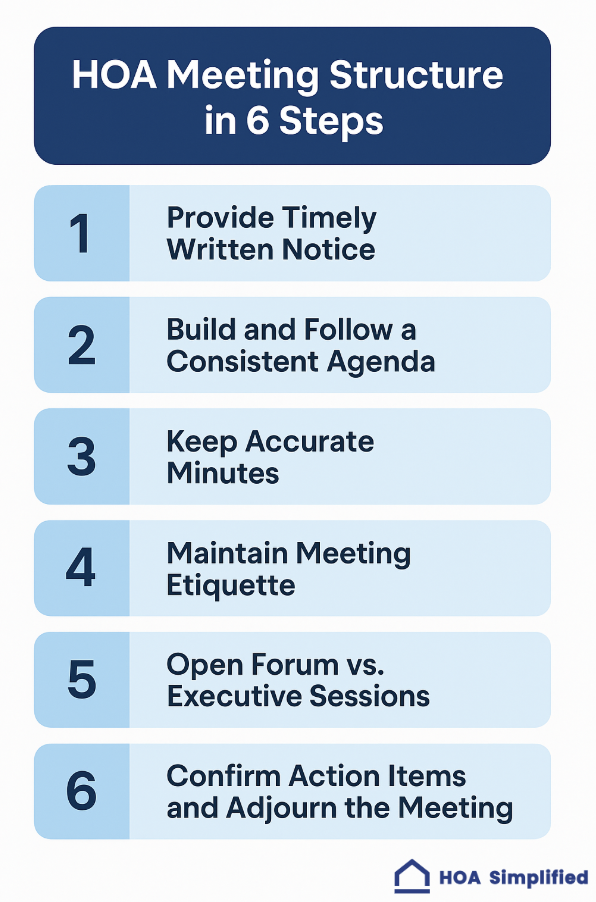 The key is consistency. Use the same structure for every meeting. Homeowners and board members alike will appreciate the predictability.